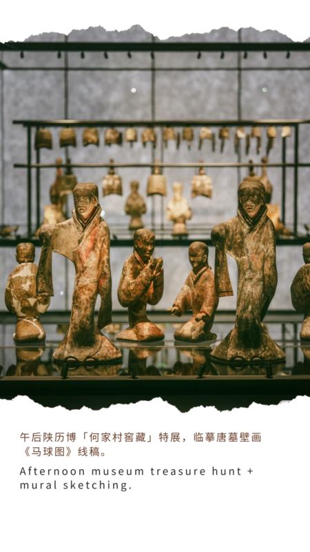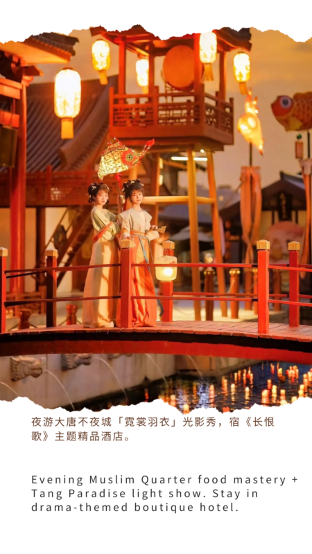 Dawn Giant Wild Goose Pagoda prayers + Tang-style photoshoot. Afternoon museum treasure hunt + mural sketching. Sunset Bell Tower fusion dinner with ceramic souvenirs.