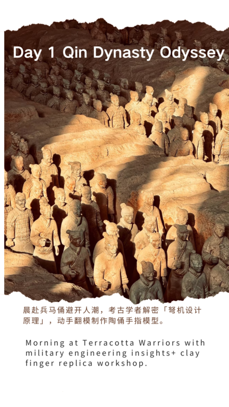 Morning at Terracotta Warriors with military engineering insights + clay finger replica workshop. Afternoon cycling Ming City Wall (photographer included). Evening Muslim Quarter food mastery + Tang Paradise light show. Stay in drama-themed boutique hotel.