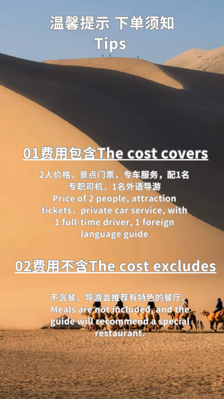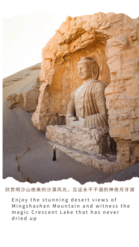 欣赏鸣沙山绝美的大漠风光,见证永不干涸的神奇月牙泉;一生一次的佛教艺术卢浮宫—莫高窟,游览古代军事防御工程明长城的起点—嘉峪关;
