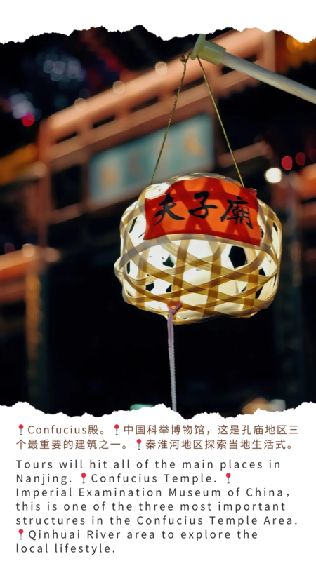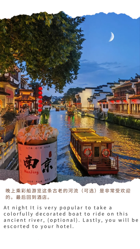 早上,自行前往南京火车站。南京导游将在火车站接您。行程将游览南京所有主要景点。📍夫子庙。📍中国科举博物馆,这是夫子庙地区最重要的三个建筑之一。📍秦淮河地区探索当地生活方式。