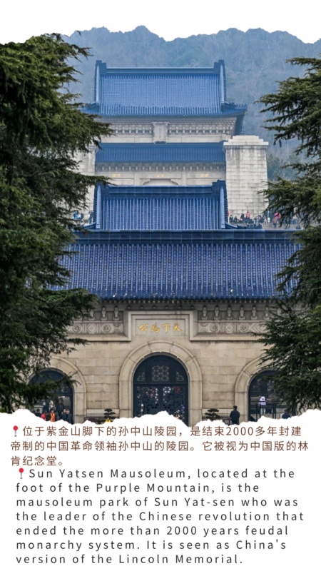📍中山陵位于紫金山脚下,是结束两千多年封建君主制的中国革命领袖孙中山先生的陵墓公园,被誉为中国的林肯纪念堂。